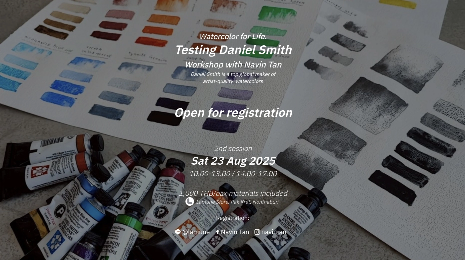 เวิร์คชอปที่ชวนทุกคนมาเรียนรู้การลองสีน้ำอย่างถูกวิธี เพื่อให้รู้จักกับคุณสมบัติของสีน้ำหลอดนั้นถึงความชอบ ความถนัดกับการใช้งานของตนเอง ผมจะสอนตั้งแต่ประเภทของสีน้ำ การอ่านชาร์ทสี วิธีการลองสีน้ำ การผสมสีเพื่อให้รู้จักคุณสมบัติทั้งหมดของสีนั้นๆ การใช้ Dot Card รวมไปถึงการเลือกสีน้ำให้เหมาะกับการใช้งานของแต่ละคน โดยทั้งหมดนี้ทางร้าน Lamune ได้ให้ Daniel Smith สีน้ำที่ศิลปินระดับโลกเลือกใช้ มาให้ทุกๆคนได้ลองใช้ในเวิร์คชอปนี้ด้วยกัน พร้อมเกร็ดเรื่องเล่าจากประสบการณ์การทำงานกับ Daniel Smith ให้กับผู้เข้าร่วม